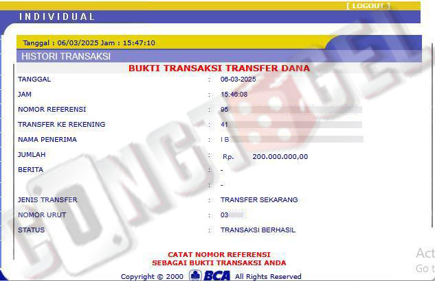 Dibawah ini merupakan bukti transfer pembayaran JP kemenangan member CONGTOGEL. Ini membuktikan jika kami adalah bandar togel yang sangat kredible dan dapat dipercaya.